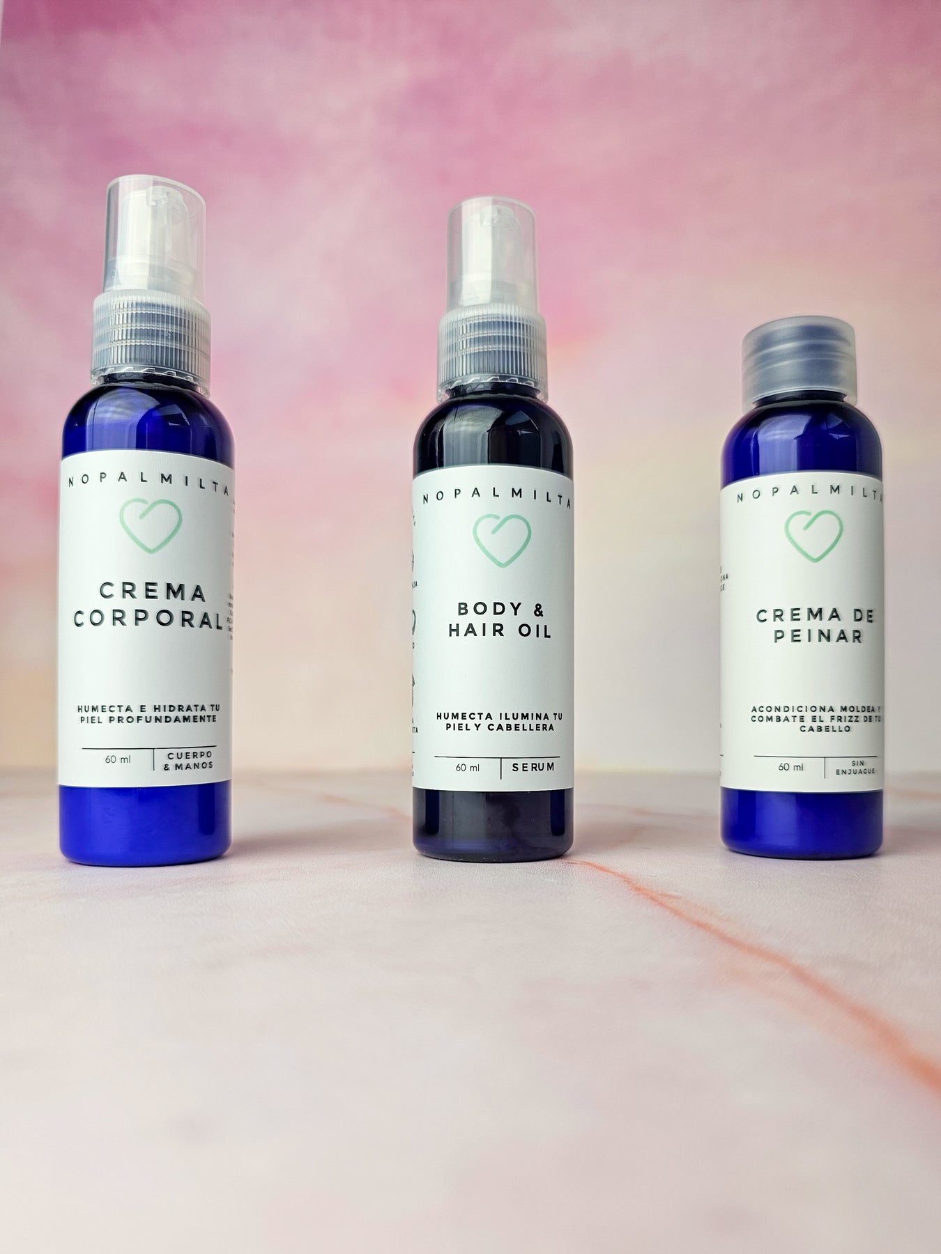 Incluye 3 productos esenciales para una rutina corporal y capilar completa: Serum  nutritivo, gel corporal sin enjuague, crema corporal y crema de peinar.